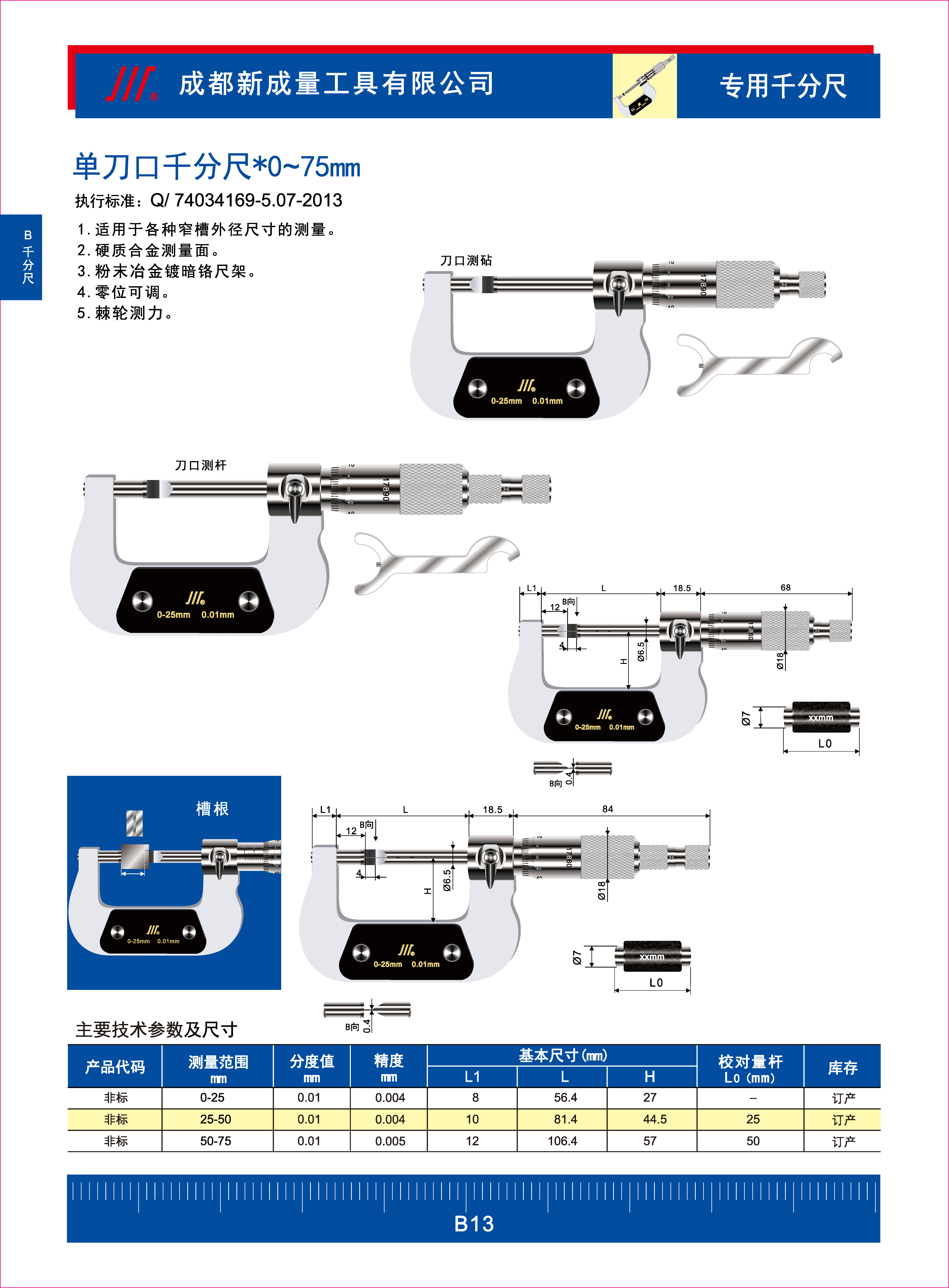 单刀口千分尺*0-75mm执行标准: Q/ 74034169-5·07-2013