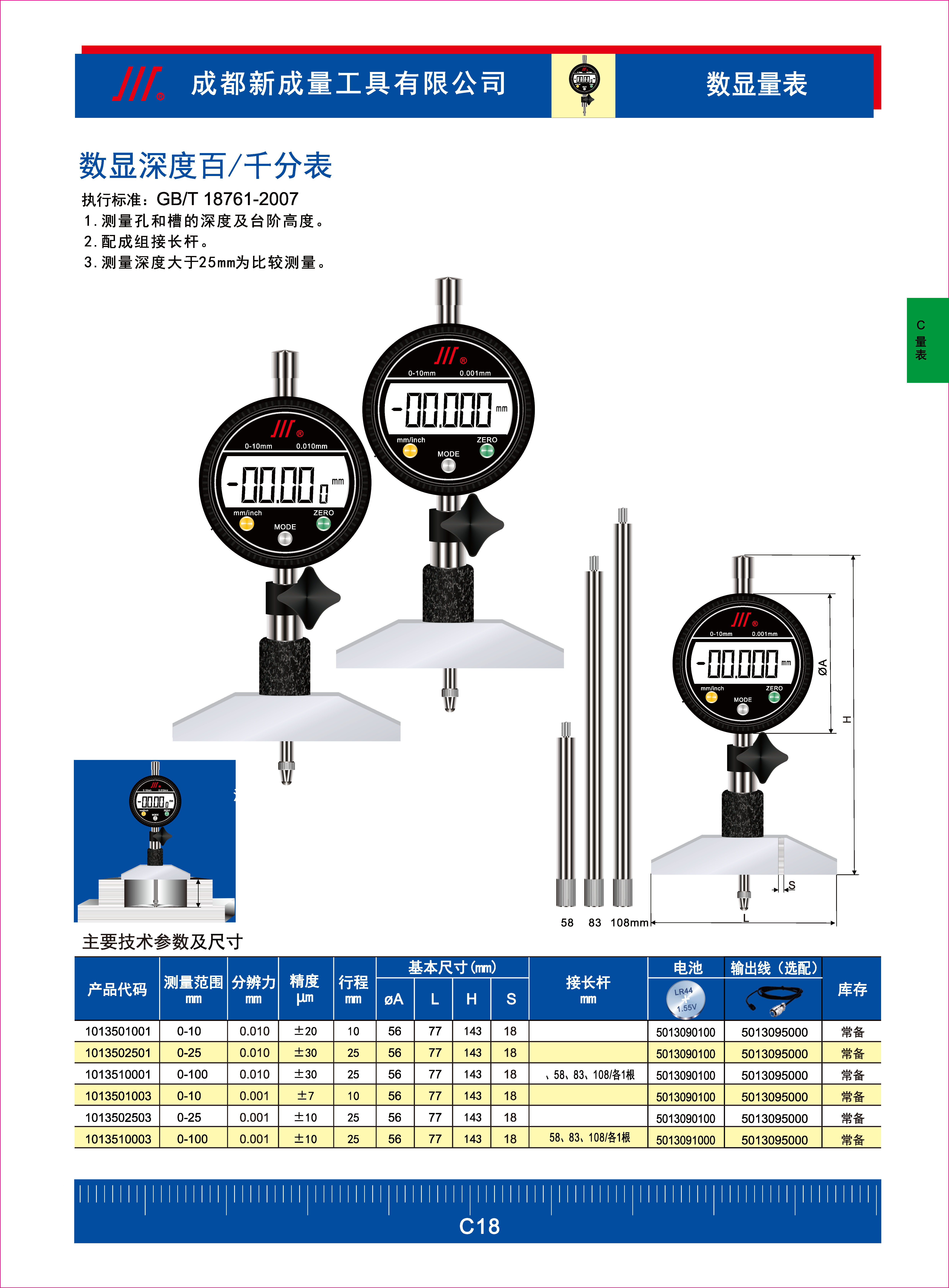 成量电子数显深度表 执行标准: GB/T 18761-2007-指示表-成量-成都成量工具有限公司,成量,成量工具,卡尺,百分表,千分尺,量具,刃具